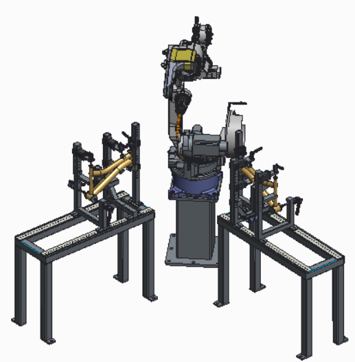 焊接工作站设有焊接机器人,配套设有智能送丝机与焊枪,驱控一体化控制器,气瓶,智能MAG焊机,自动化防护挡板,四周设有外围围栏,两套车架前三角三维柔性万能组合工装平台或车架后三角上叉三维柔性万能组合工装平台或各一套车架前三角三维柔性万能组合工装平台和车架后三角上叉三维柔性万能组合工装平台。