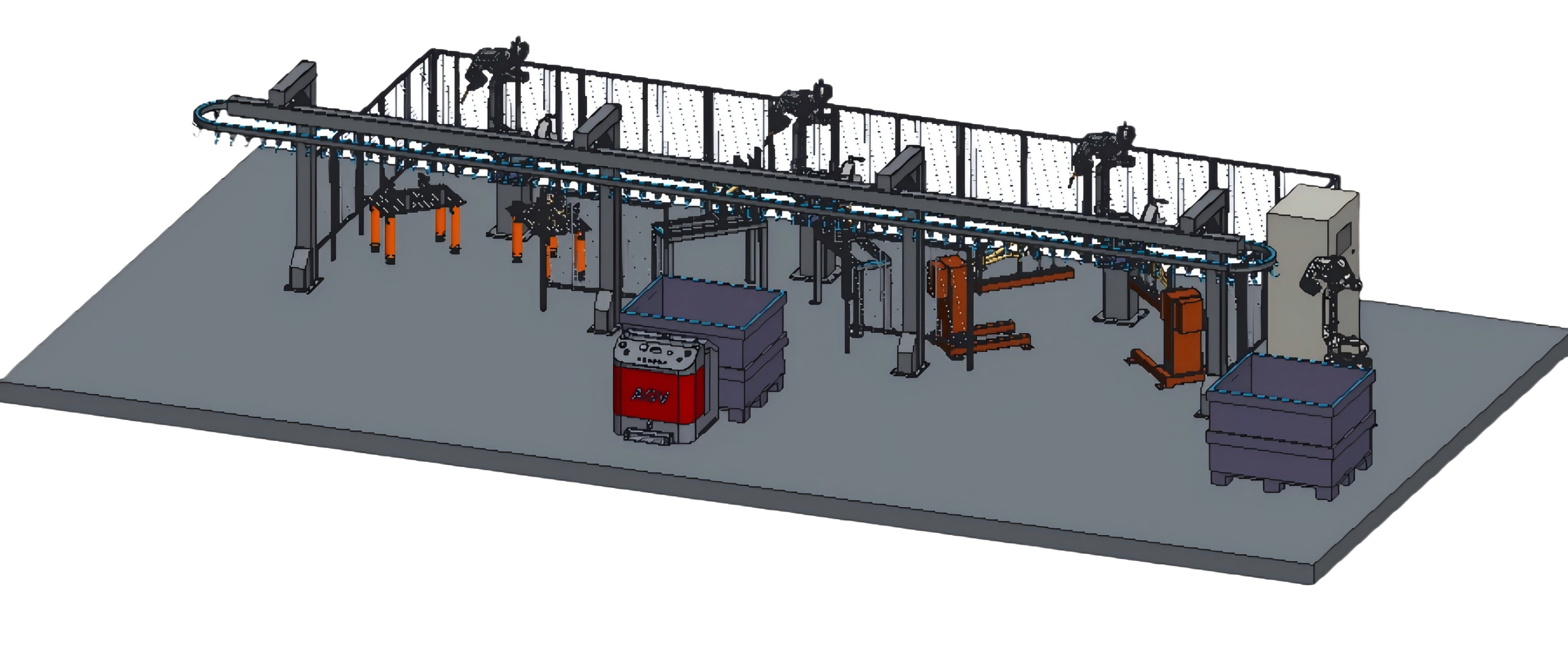 焊接工作站设有焊接机器人,配套设有智能送丝机与焊枪,驱控一体化控制器,气瓶,智能MAG焊机,自动化防护挡板,四周设有外围围栏,两套车架总装三维柔性万能组合工装平台及两个L型附加轴变位机。